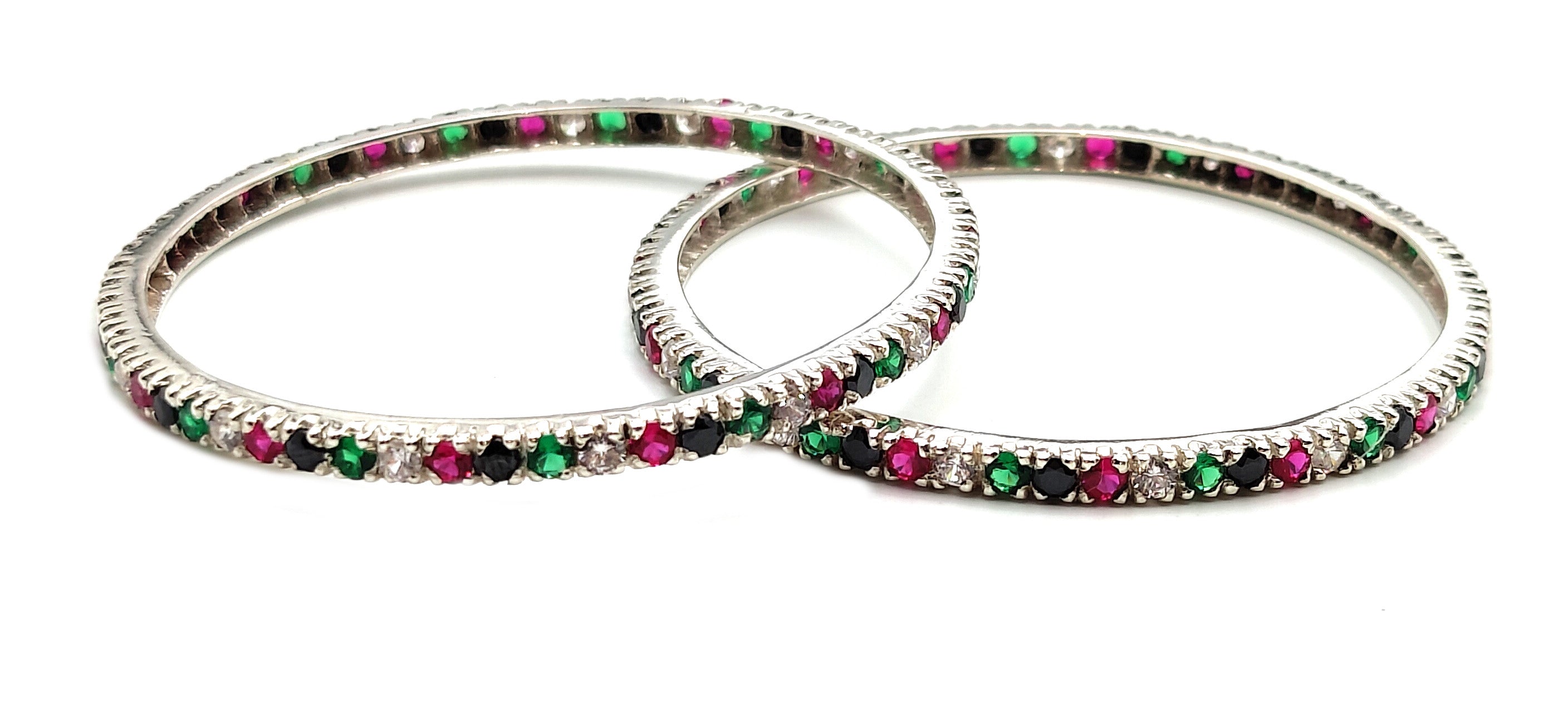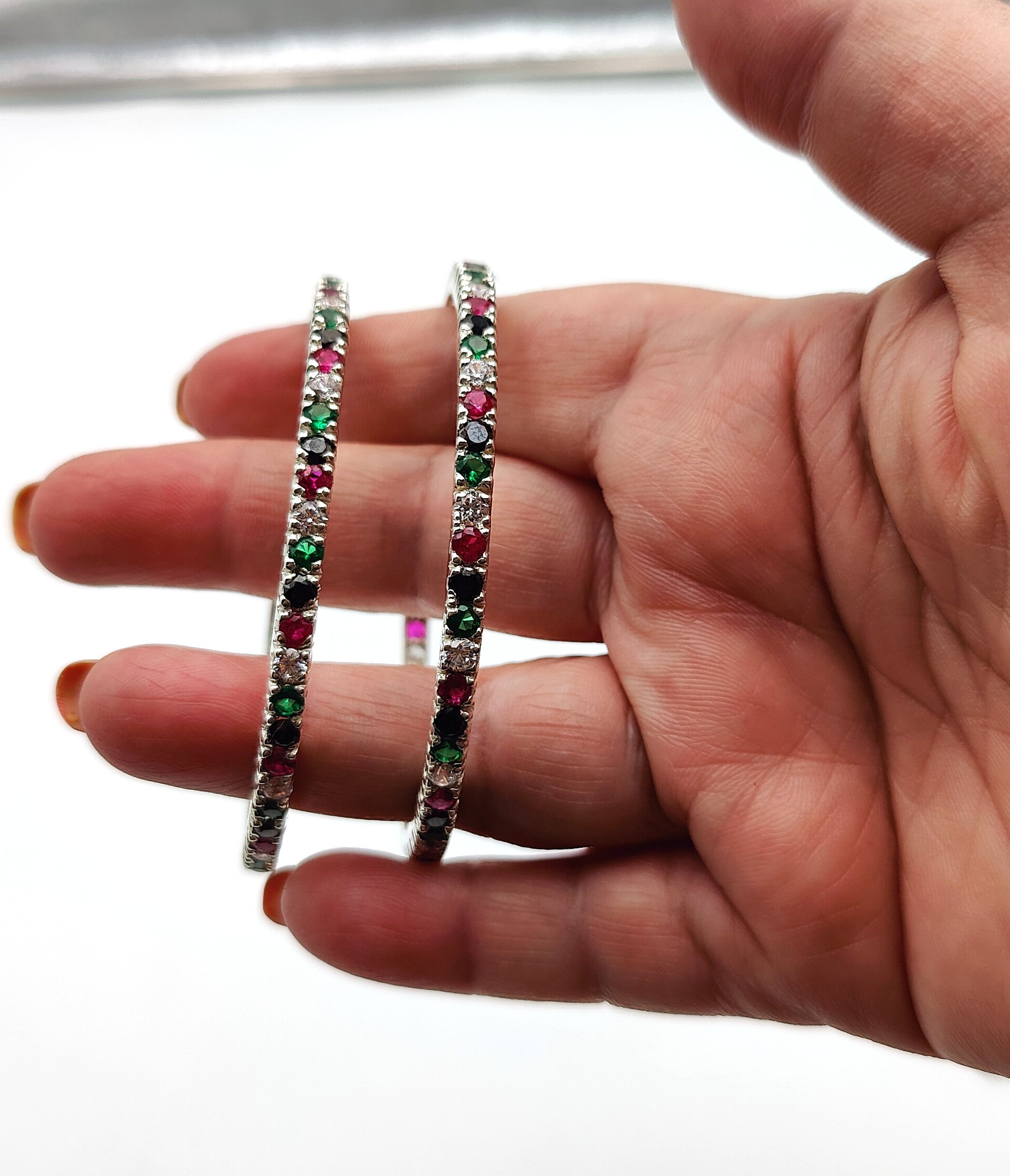 This Silver Multicolor Stones Bangle for Women/Girls features an elegant design with high-quality silver and beautiful multicolor stones. Perfect for adding a touch of sophistication to any outfit. Made with durable materials for long-lasting wear and a comfortable fit. Elevate your style with this stunning bangle.