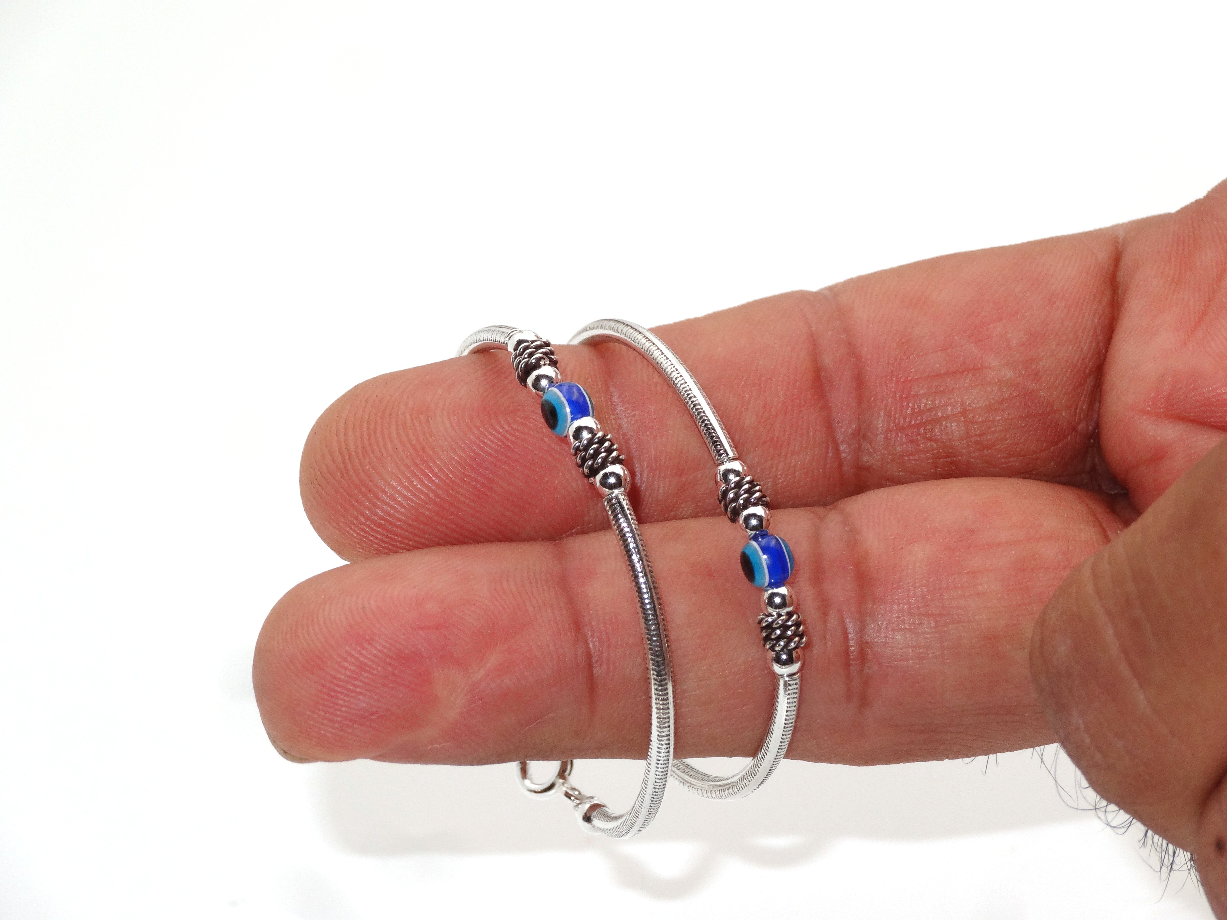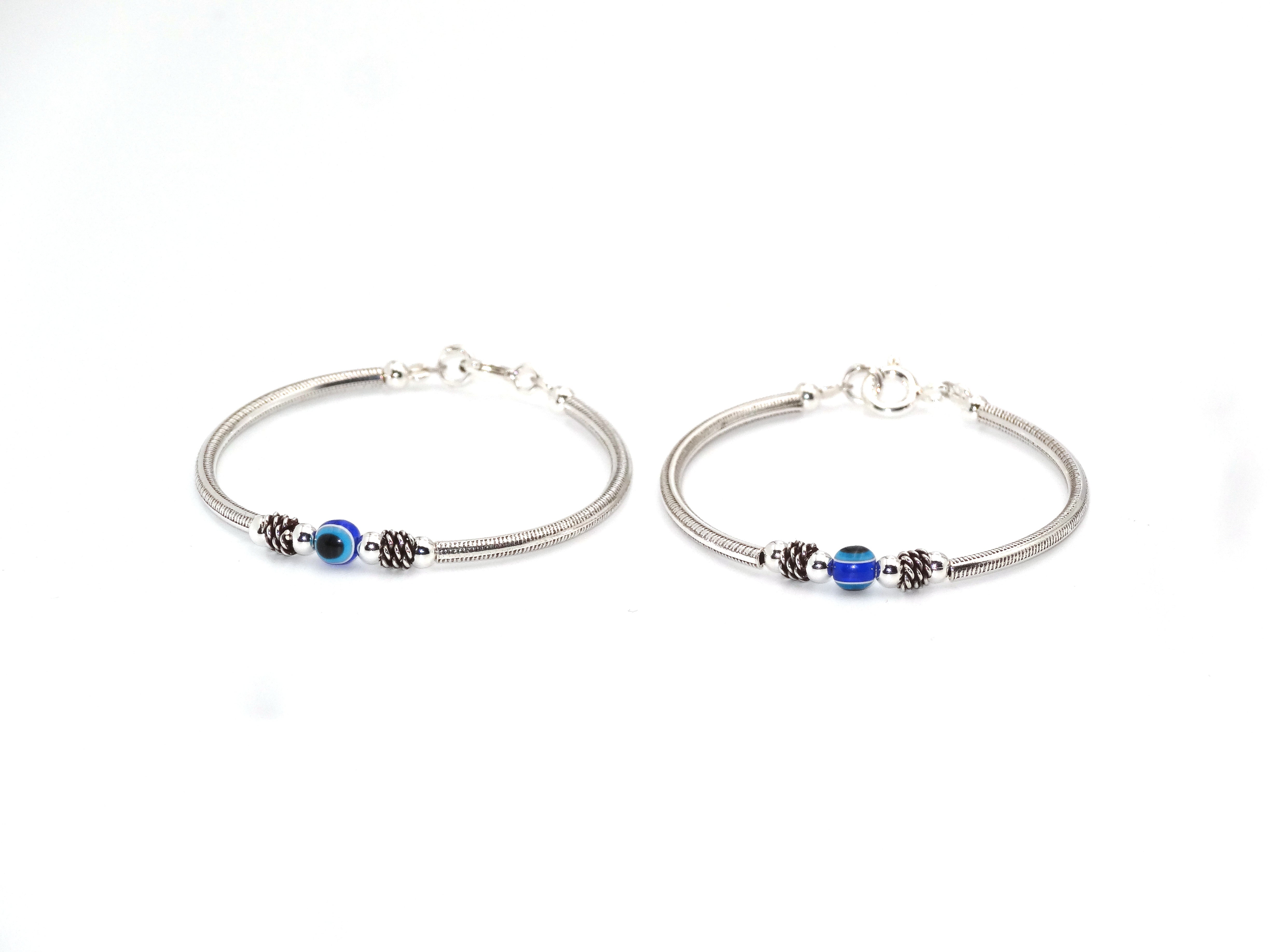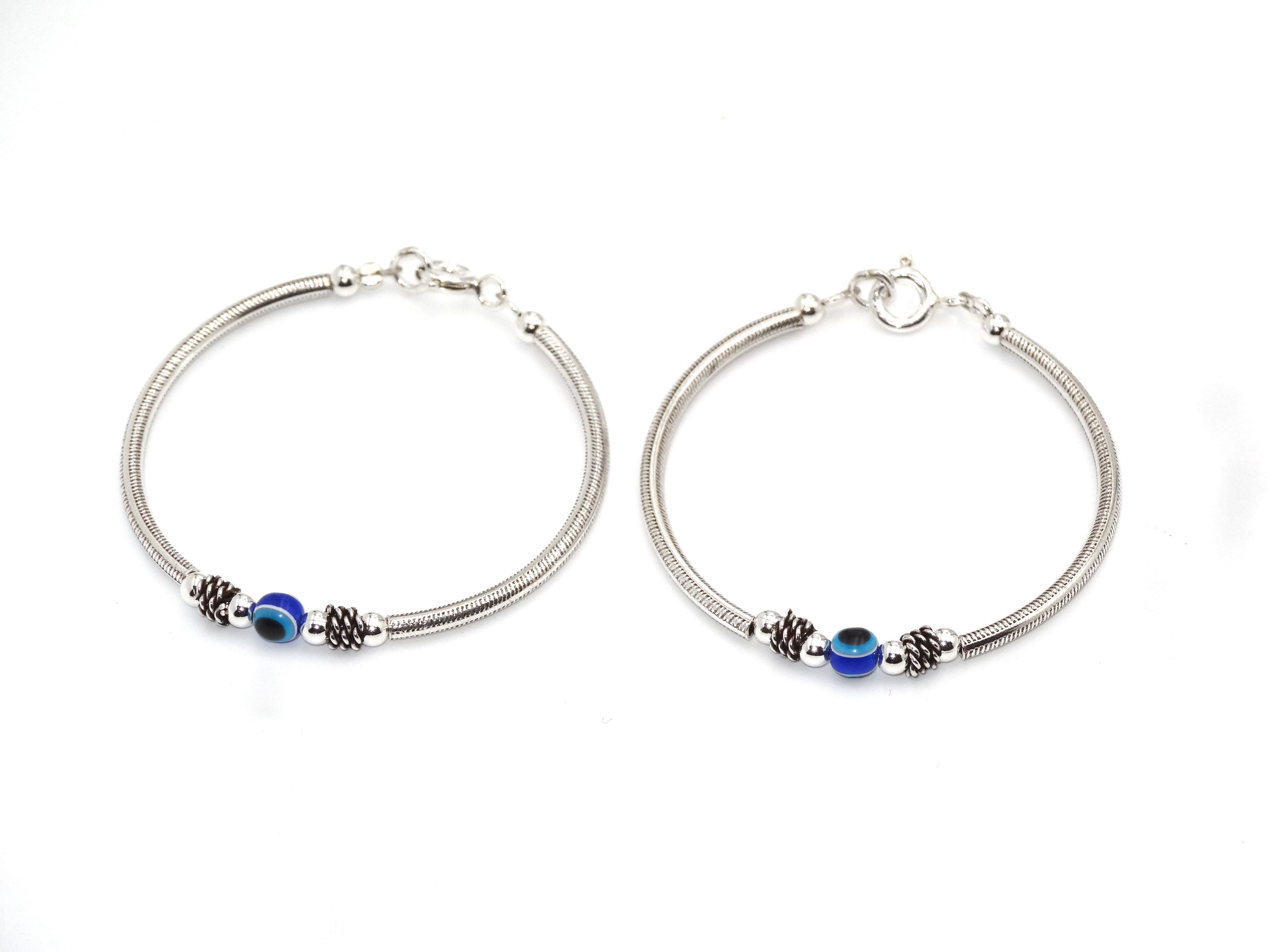 Sterling Silver 925 Oxidised Bangles for Unisex Child. Bangle Diameter: 3.8 centimeters. Intricate Workmanship with Evil Eye Ball. Medium Size, 1 Pair Perfect for Wearing and Gifting.