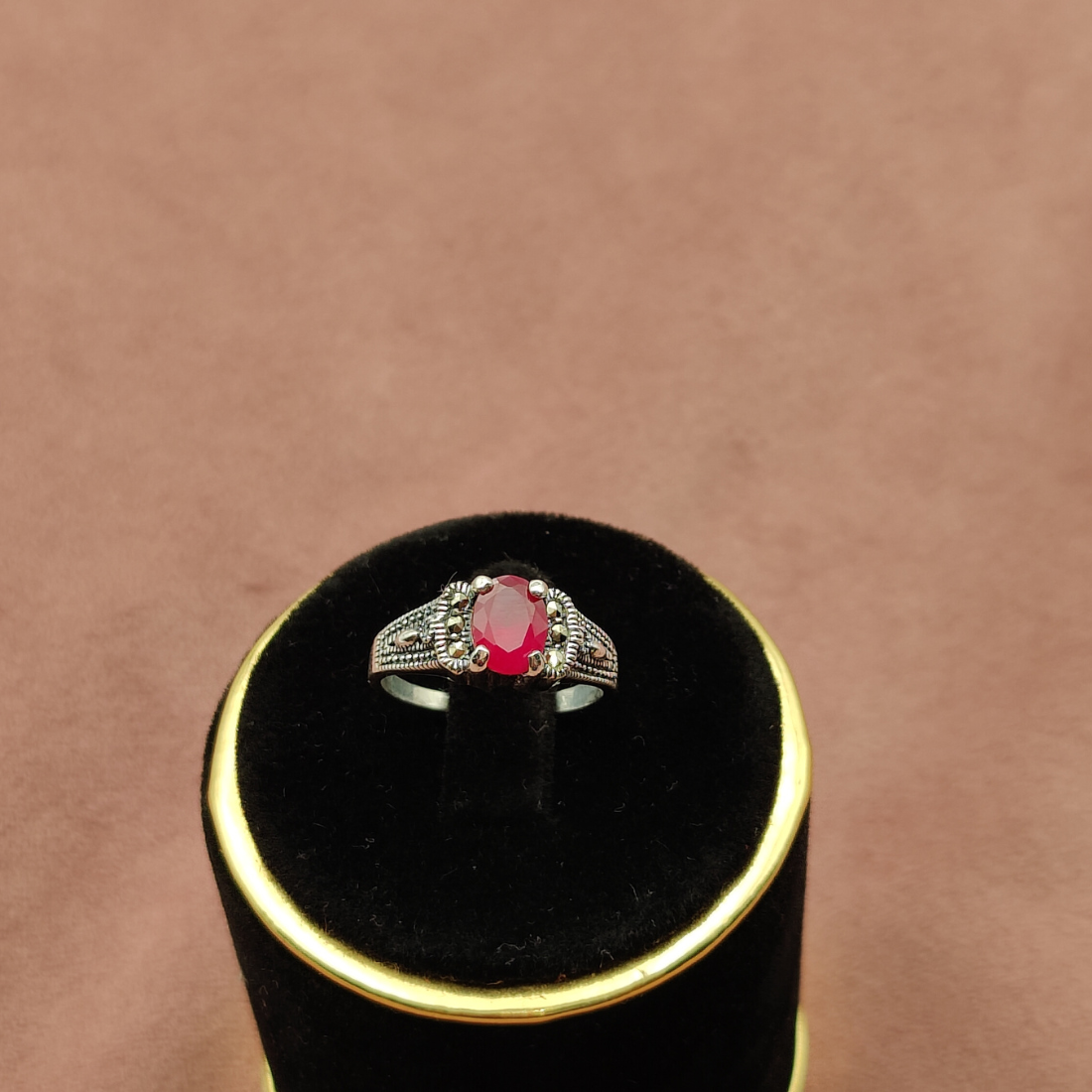 This 925 silver ring features a vibrant ruby accented with sparkling mercasite stones. Crafted with expert techniques, it exudes a timeless elegance perfect for any occasion. Show her your love and appreciation with this stunning piece that will make her shine.