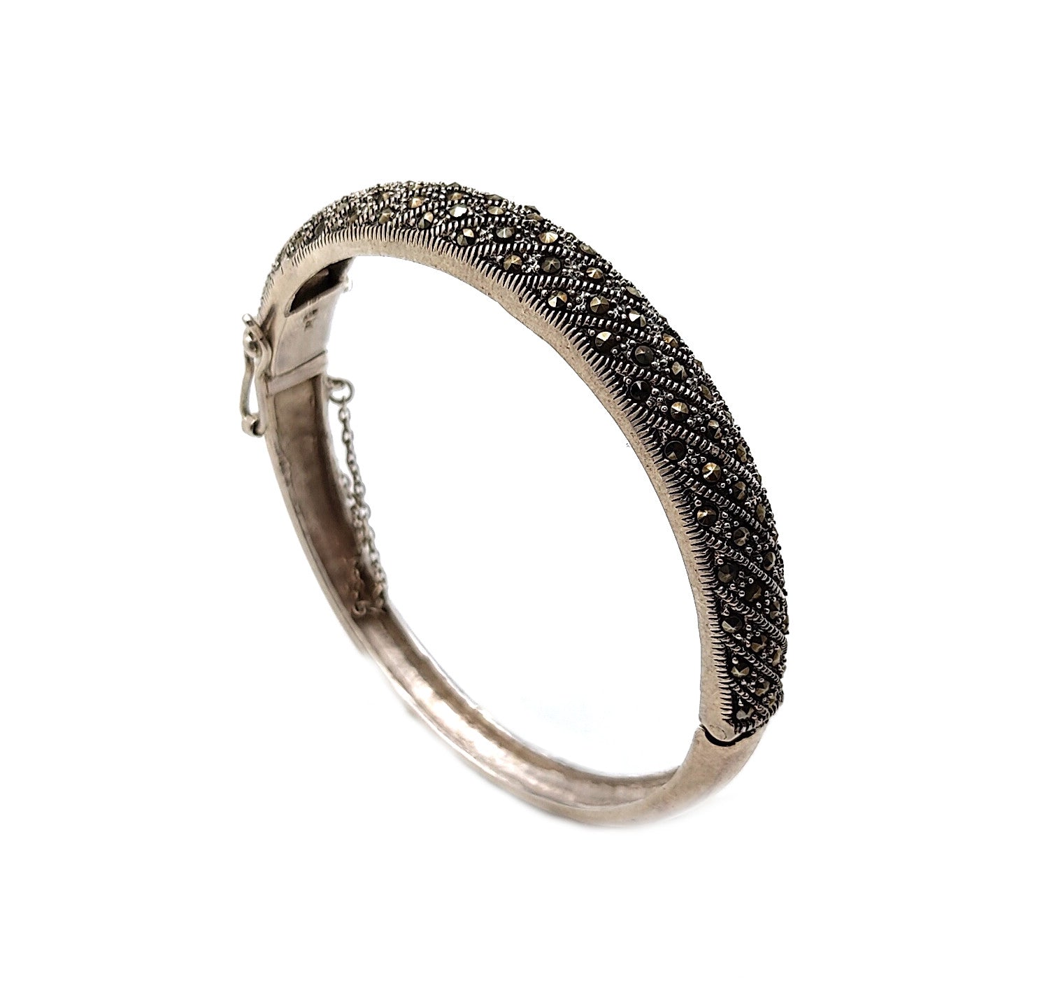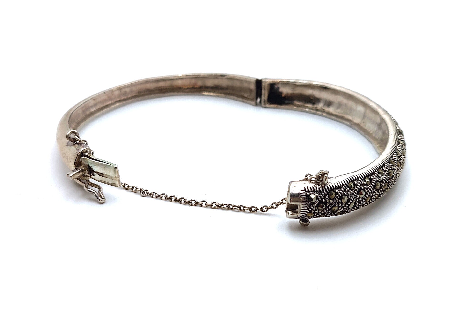 This elegant Silver Mercasite Stones Bangle is perfect for women and girls alike. The shimmering stones add a touch of glamour and sophistication to any outfit. Made with genuine silver, this bangle is stylish and durable. Complete your look with this beautiful accessory.