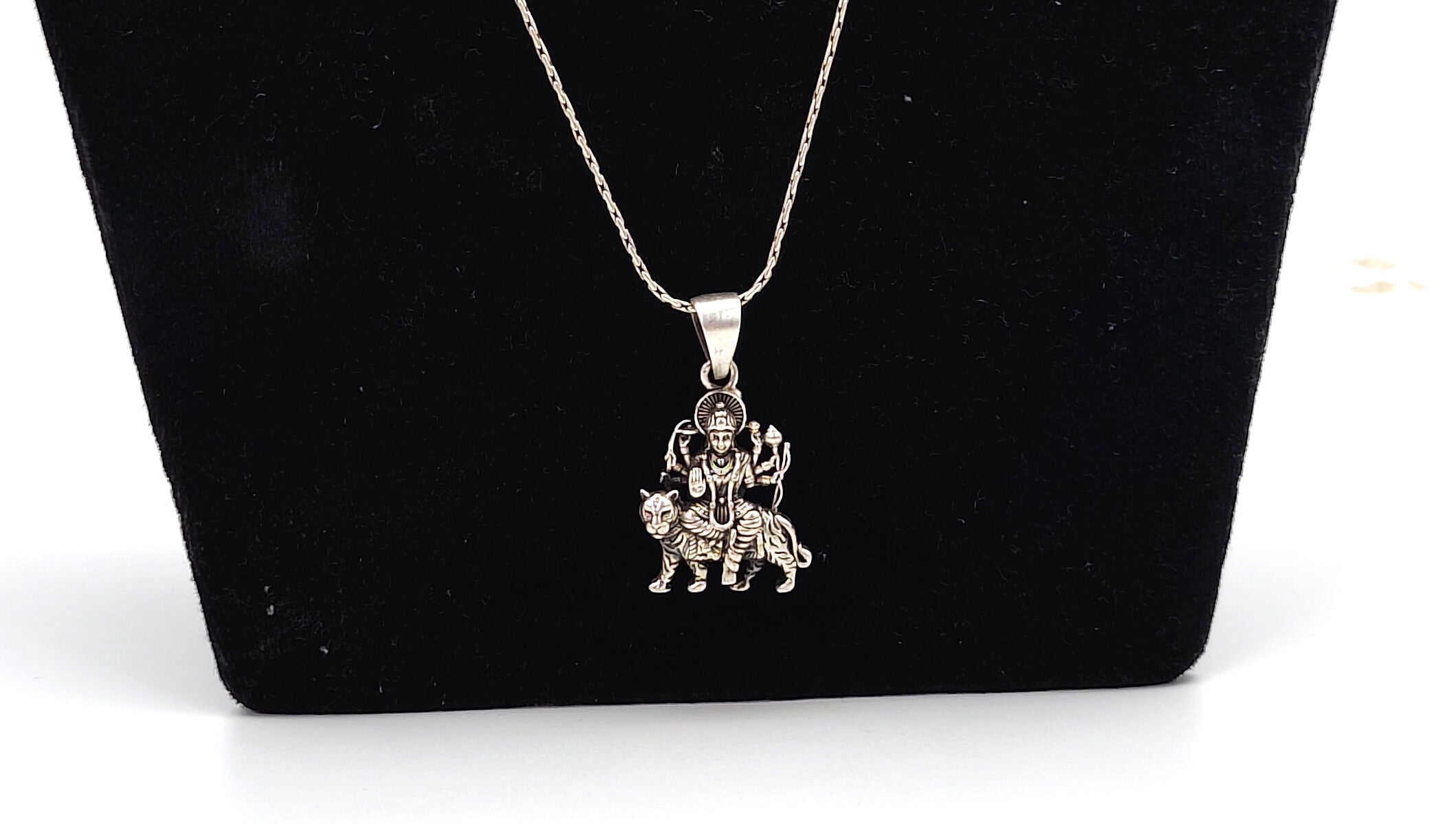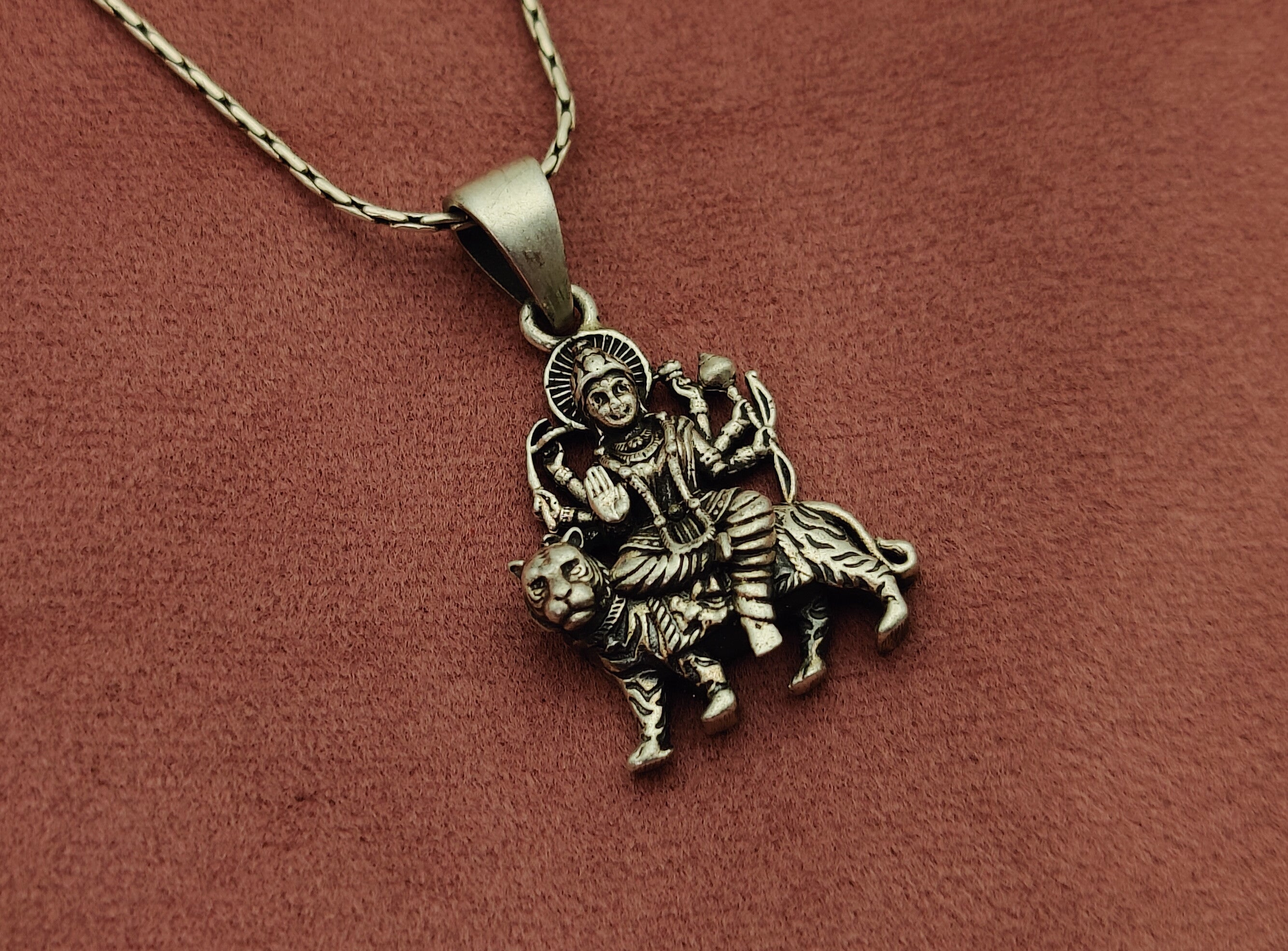 Beautifully handcrafted in pure 925 sterling silver, this devotional pendant features a powerful and serene depiction of Mata Rani (Durga Maa)—symbolizing strength, protection, and divine grace. The oxidised antique finish adds a traditional touch, making it a timeless piece of spiritual jewellery.