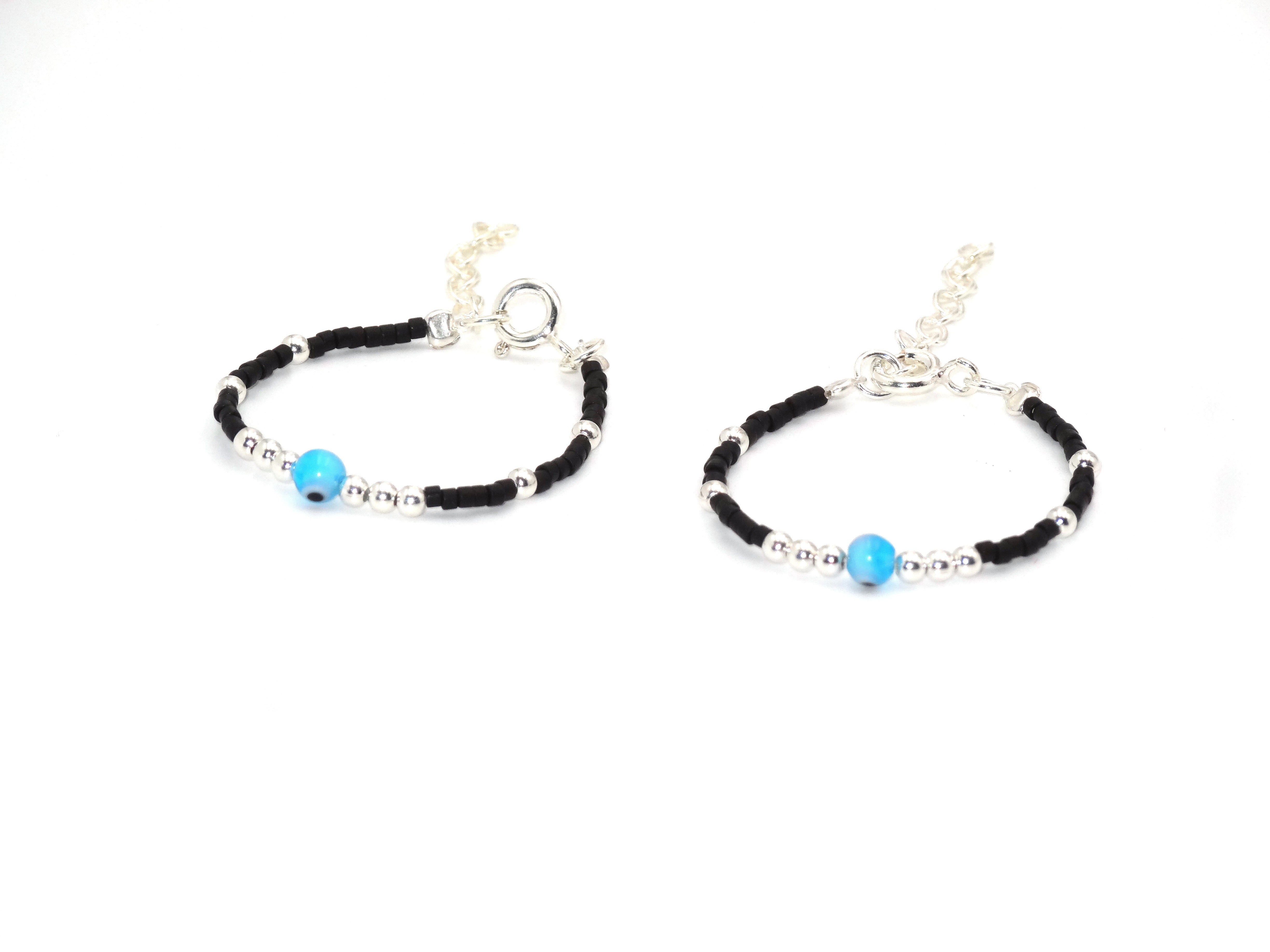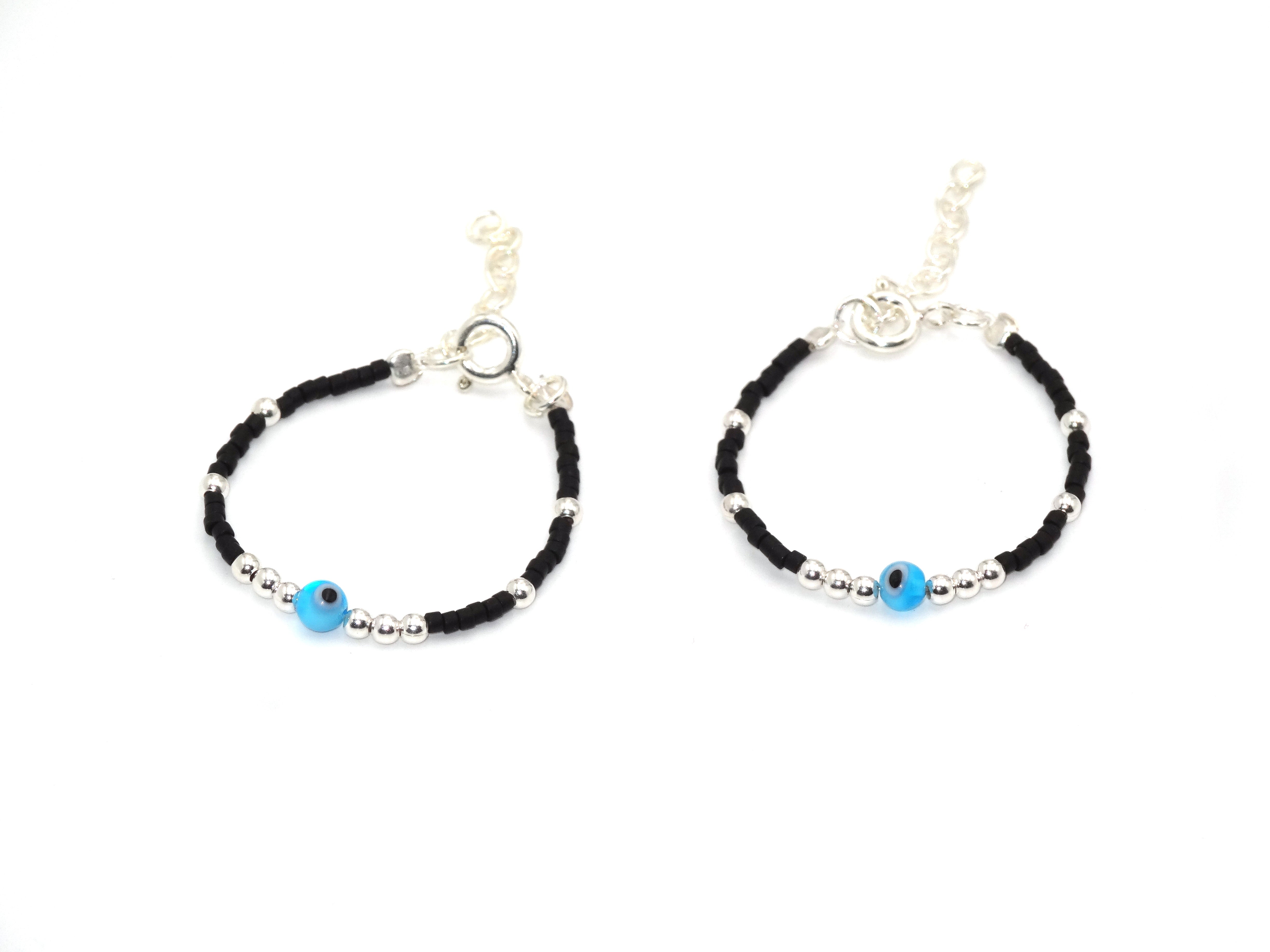 Sterling Silver 925 Oxidised Bangles for Unisex Child. Bangle Diameter: 2.7 centimeters. Black Beats with Evil Eye Ball. Medium Size, 1 Pair Perfect for Wearing and Gifting.