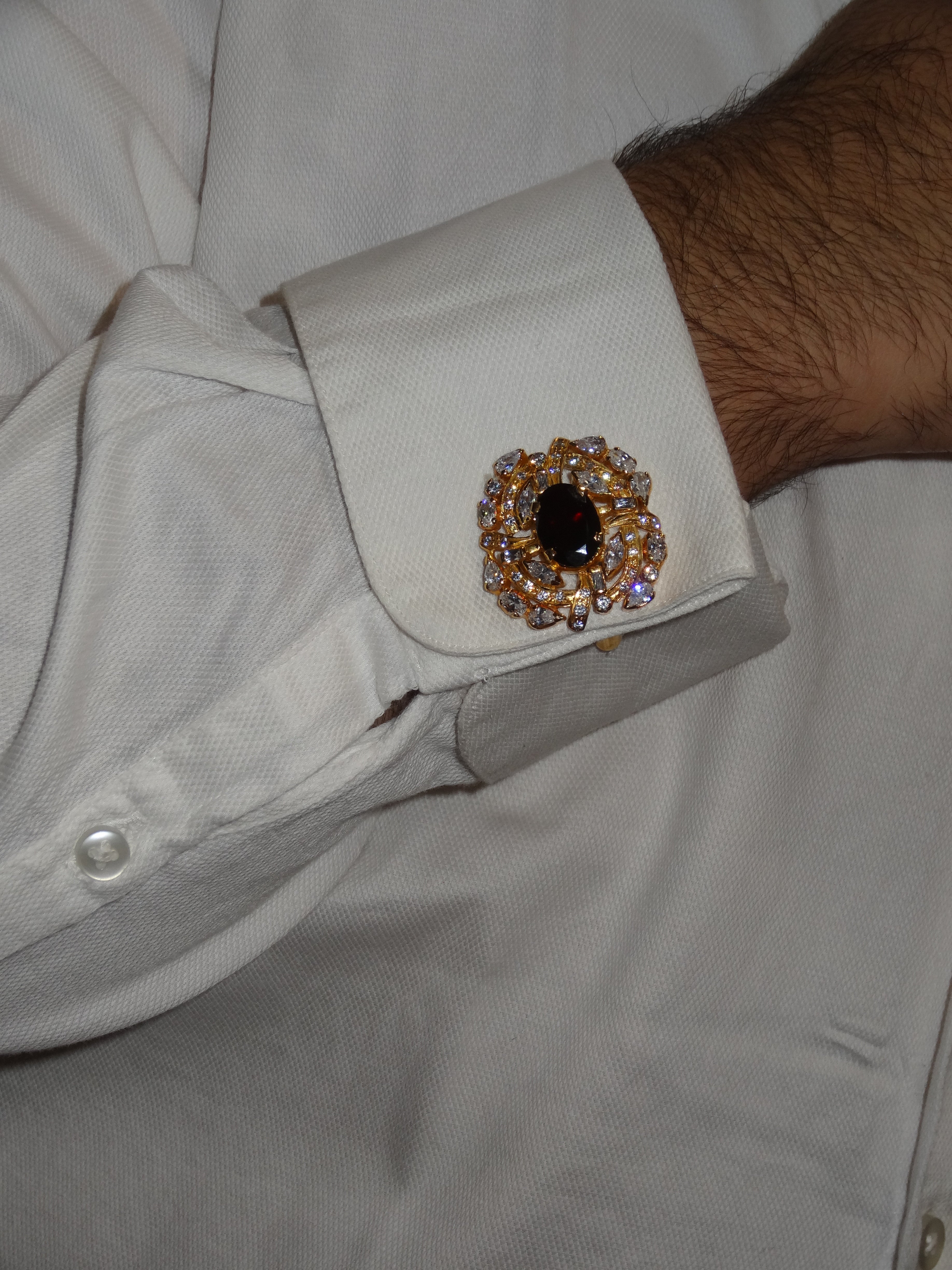 These stunning Silver Gold Plated Cufflinks for Him feature a luxurious gold plating and are decorated with cubic zirconia and black garnet stones for a touch of elegance. Make a lasting impression with this impeccably crafted accessory.