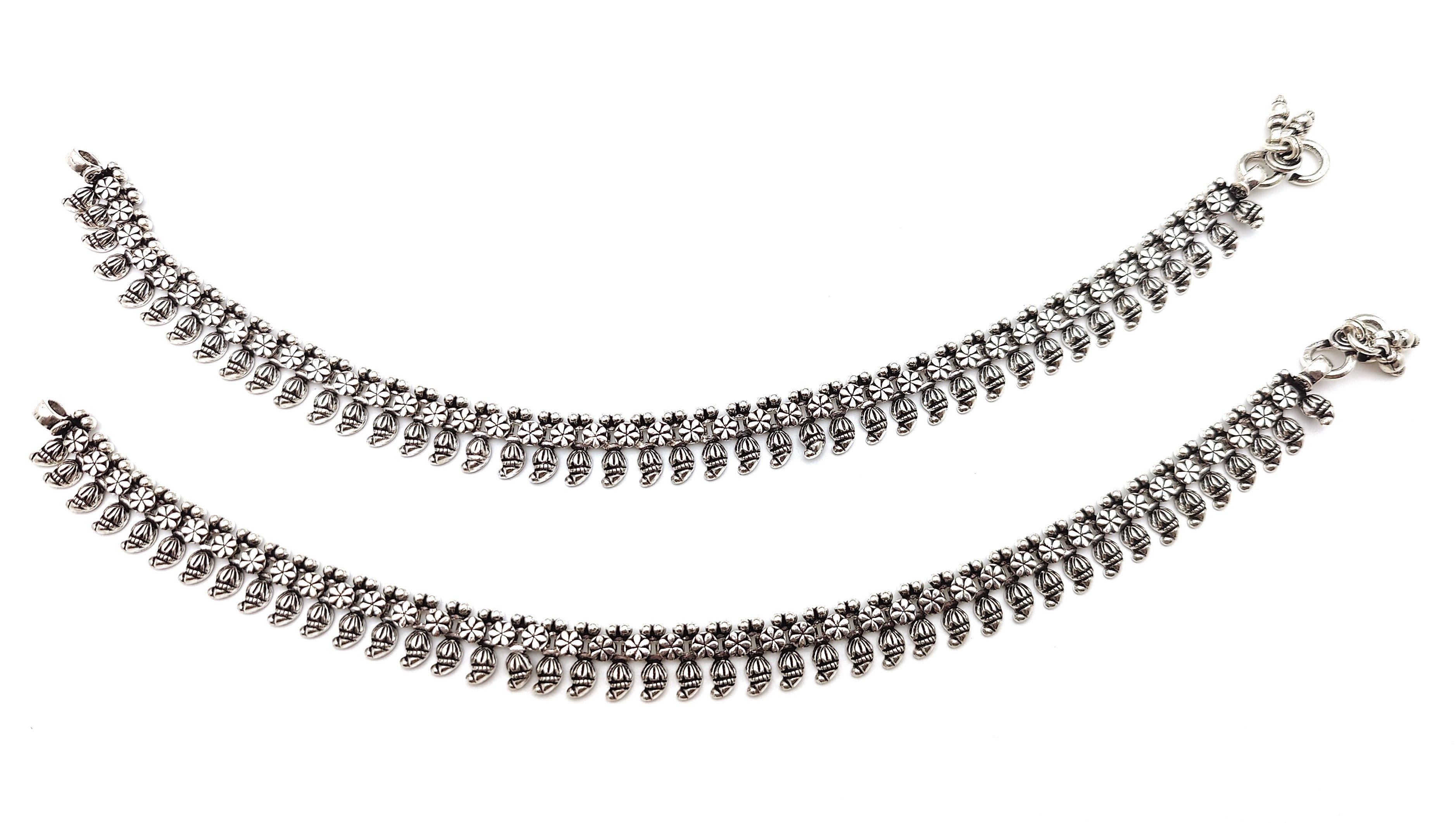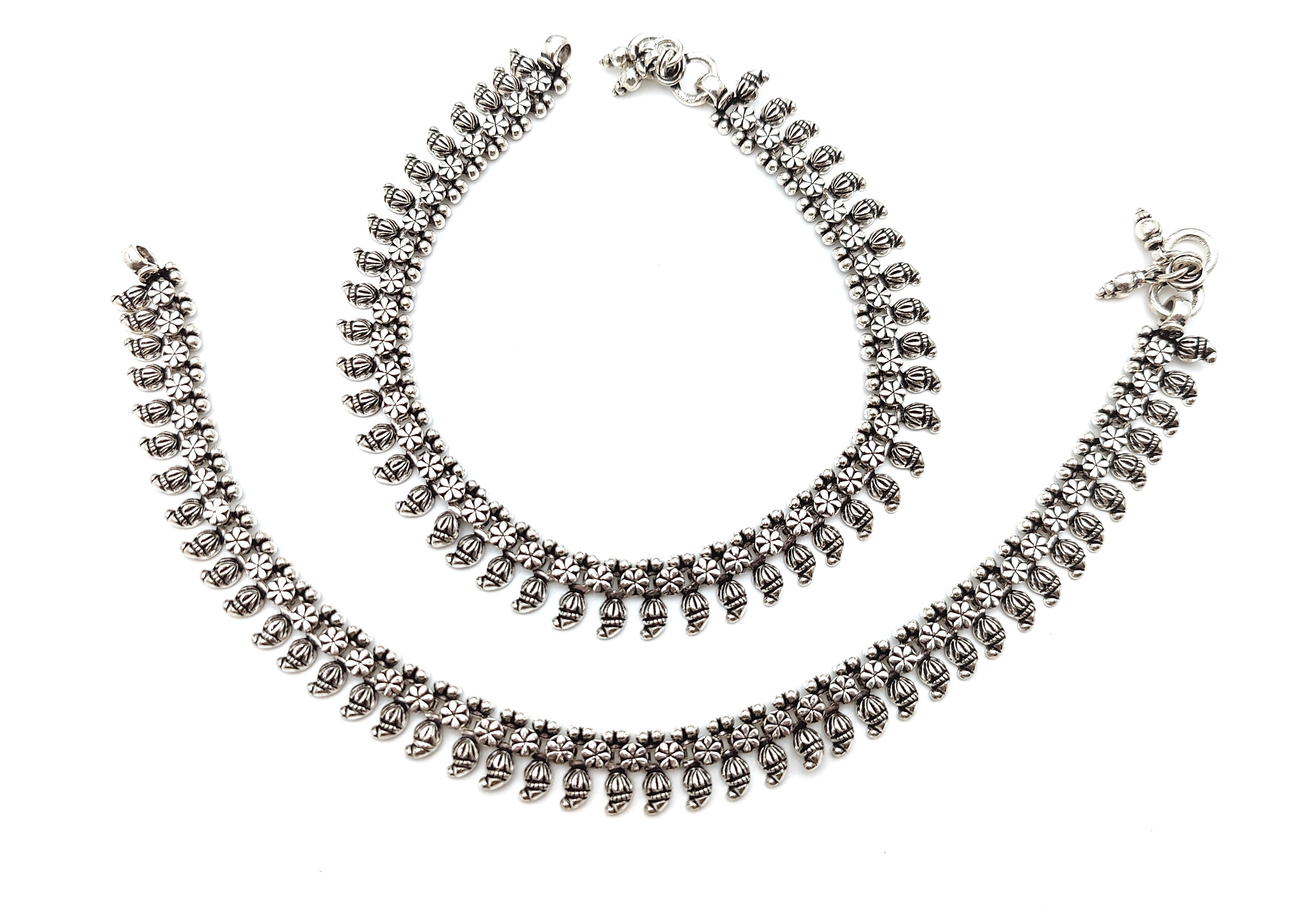 Crafted from genuine 925 Sterling Silver, these anklets feature a deep, beautiful oxidized finish. This traditional technique darkens the silver in the recesses of the design, beautifully highlighting the intricate detail of the small, stacked flower motifs and the distinct dangling elements below. The heavy look gives them the highly sought-after charm of antique heirloom jewelry.